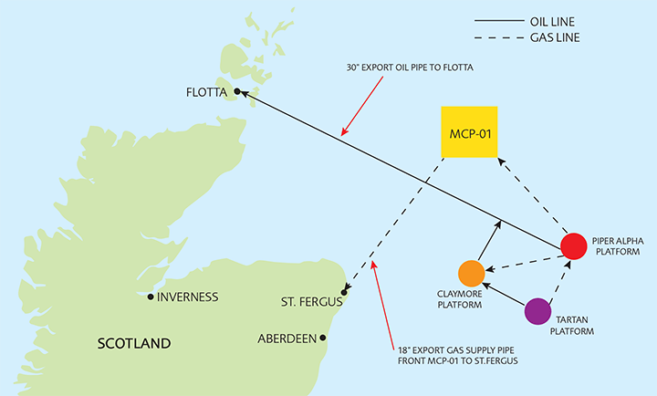 Oil exported from Tartan and Claymore flowed out of the ruptured oil line on Piper Alpha, flooded the floor and overflowed to the floor beneath, starting a large pool fire which impinged directly on the gas import and export lines, leading to their rupture – and hence to the inevitable escalation of events on Piper Alpha.